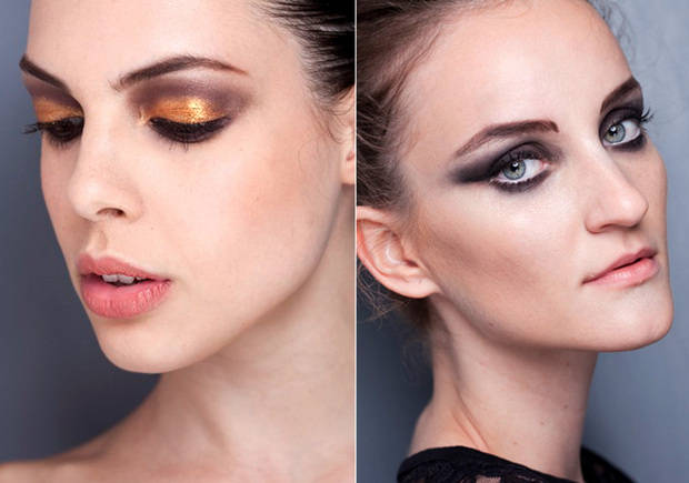 Estão em alta os tons marrons terrosos, os escuros como o preto, o dourado com roxo e azul marinho alta! E também os metalizados que vem ganhando cada vez mais espaço. Para finalizar, muito lápis preto e rímel. Se preferir um efeito ainda mais dramático esfume as cores para além da região dos olhos ou aposte nos formatos geométricos. A dica é evitar limites duros nas transições entre as cores e esfume bastante até obter um acabamento delicado. Delineador preto e cílios postiços também estão super na moda!