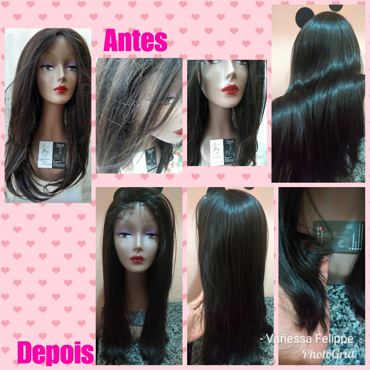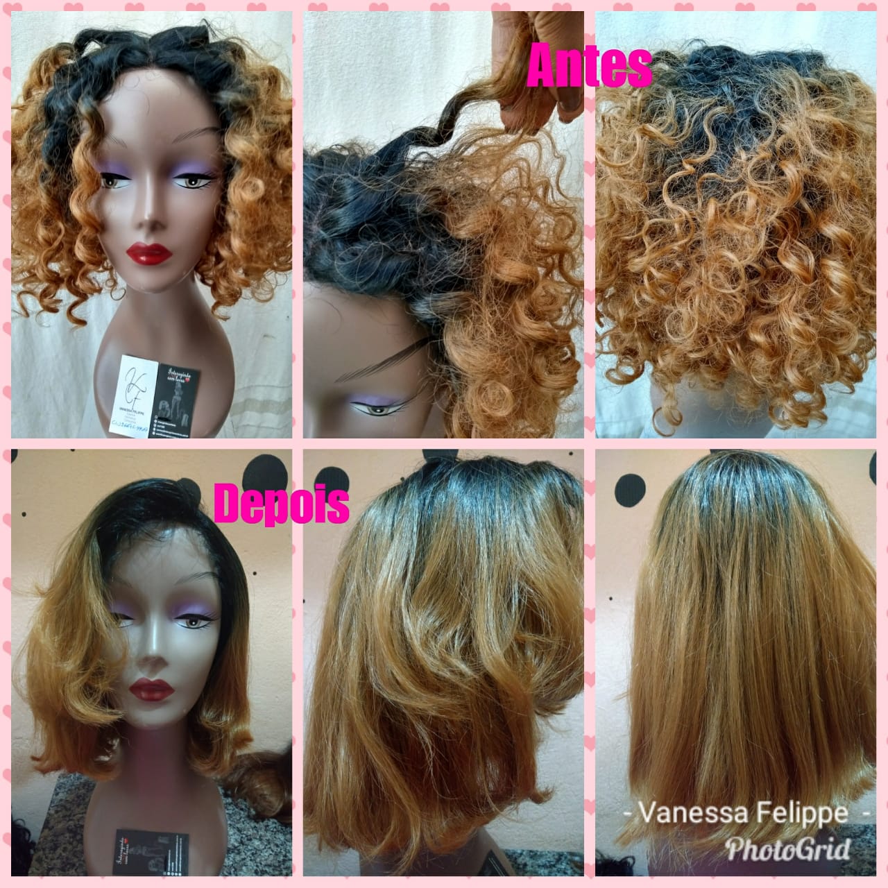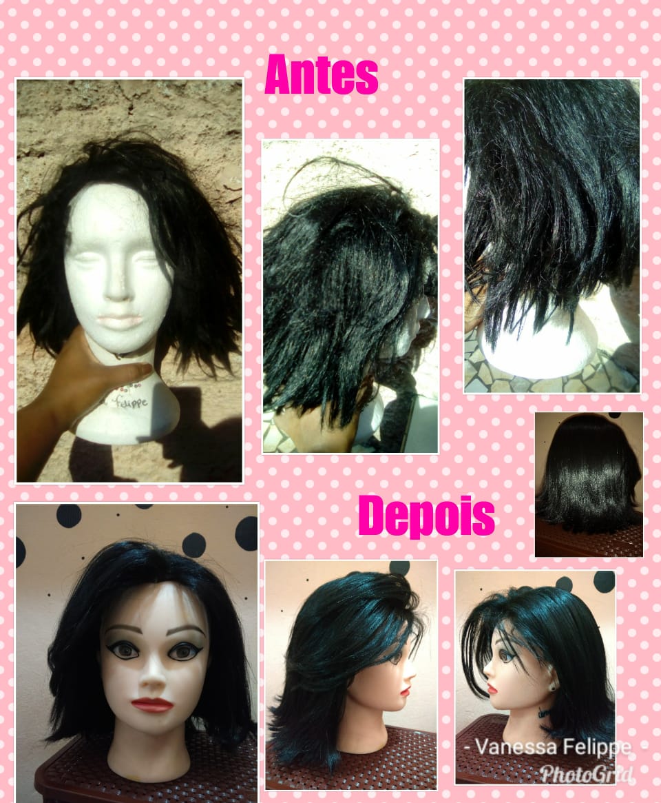 Com isso pode testar em cada uma delas, técnicas diferentes para cuidar e manter. Até que um dia uma delas rasgou, e teve que costurar. A outra lace que chegou não veio com o corte que mostrada na foto, então ela aprendeu a fazer o corte (que difere do cabelo humano) quando se trata de cabelo sintético.
